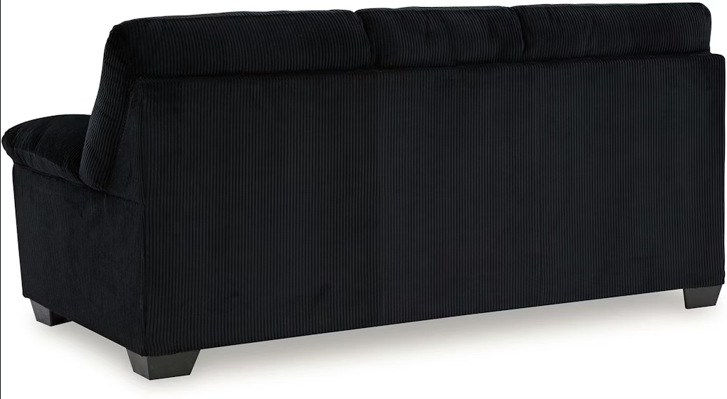 Tapițeria este realizată într-o nuanță rafinată de negru, cu o textură moale și plăcută la atingere, ușor de integrat în orice tip de decor. Designul clasic, cu brațe rotunjite și perne groase, oferă un aspect elegant și un confort superior.