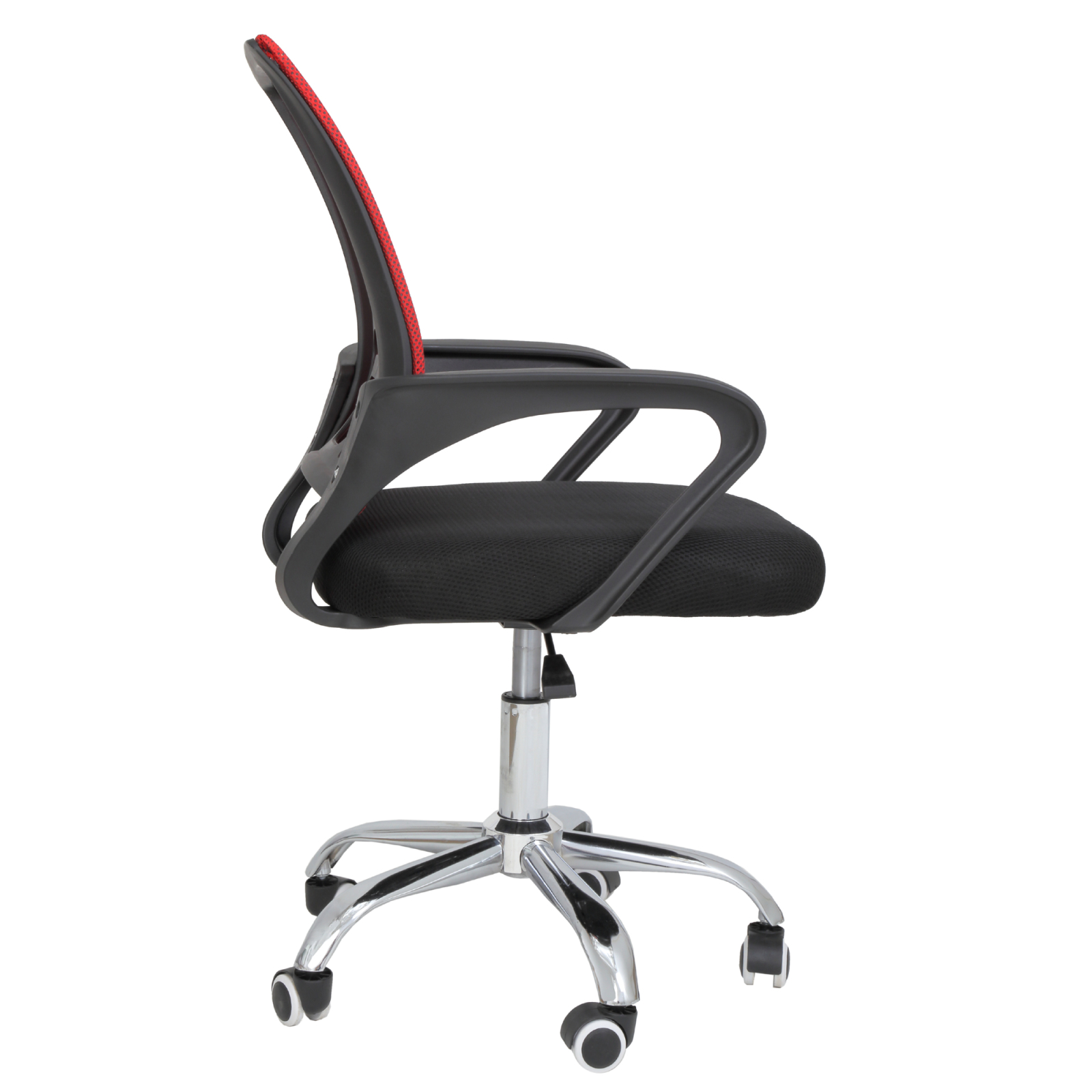 Spatar din nylon, tapitat cu mesh. Suport lombar fix din nyon. Brate fixe din nylon. Sezut din spuma poliuretanica reciclata, cu interior din lemn stratificat. Mecanism clasic cu ajustarea inaltimii. Cilindru cu gaz cromat certificat Bifma. Baza cromata cu 5 picioare, cu diametru 550 mm. Role din nylon cu suprafata de rulare moale, cu diametru de 50 mm.