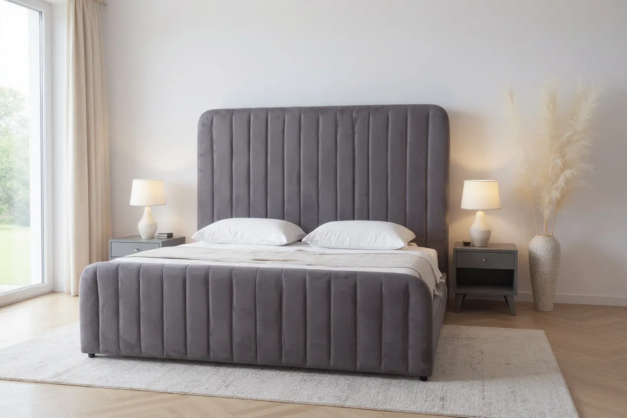 Design tăblie: Tăblie înaltă, tapițată vertical, cu canale matlasate – oferă un aspect elegant, minimalist și contemporan
