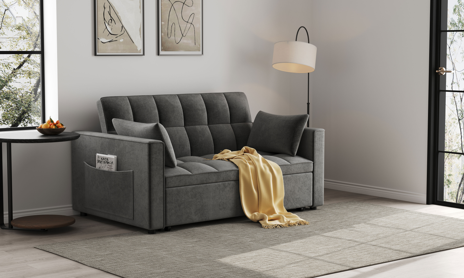 Este tapițată într-o nuanță elegantă de gri, având spătar și șezut capitonate cu un model pătrat, ce oferă atât confort, cât și un aspect rafinat. Designul este minimalist, dar practic – brațele laterale includ un buzunar util pentru reviste sau telecomandă, iar cele două perne decorative adaugă un plus de confort.