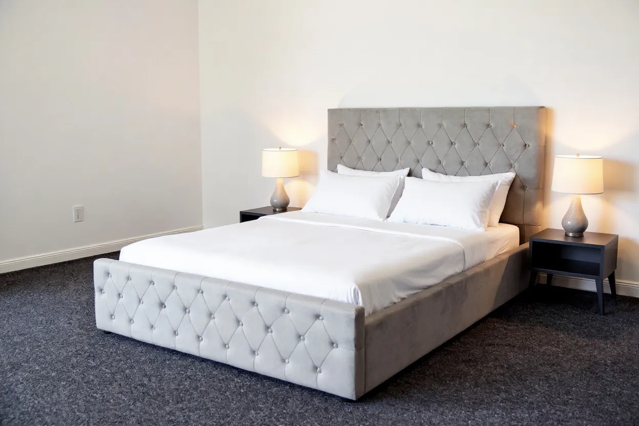 Cadru și tablie frontală: Tapițate în același stil, cu matlasare uniformă pentru un aspect armonios