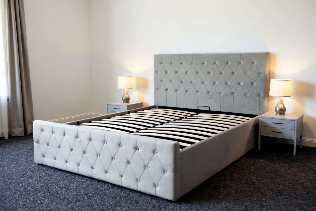Spațiu de depozitare: Lada de depozitare generoasă, ascunsă sub somieră – perfectă pentru lenjerii, pilote, perne sau alte obiecte