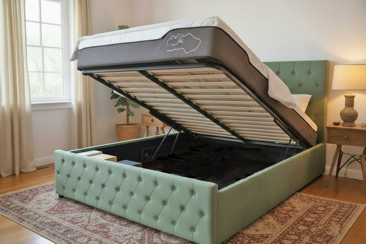 Spațiu de depozitare: Lada de depozitare generoasă, ascunsă sub somieră – perfectă pentru lenjerii, pilote, perne sau alte obiecte