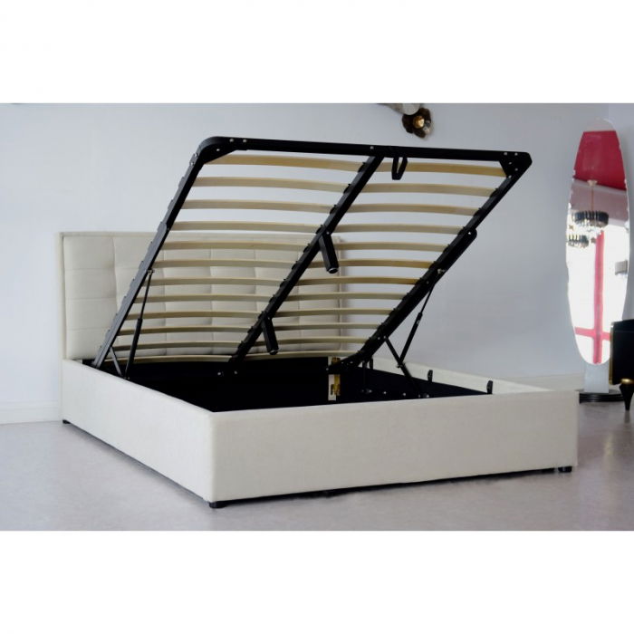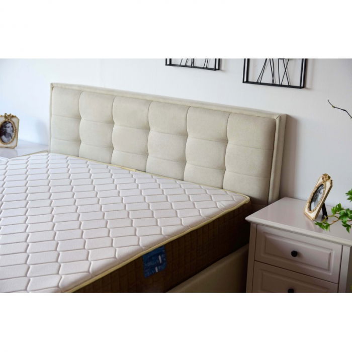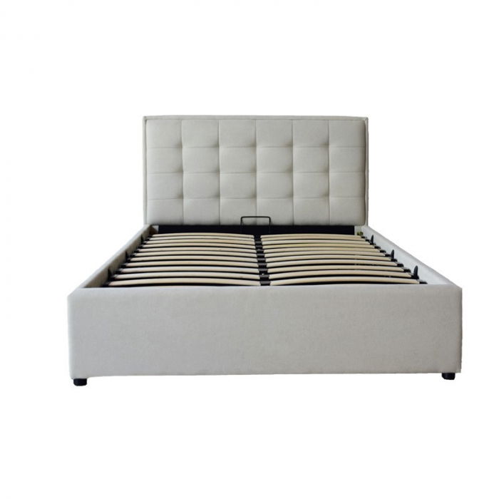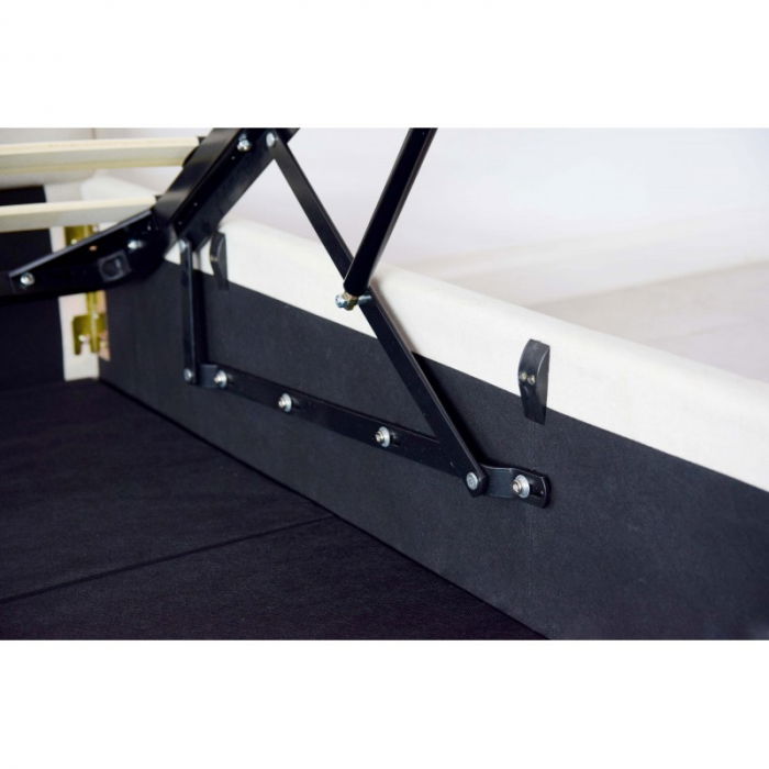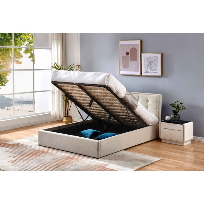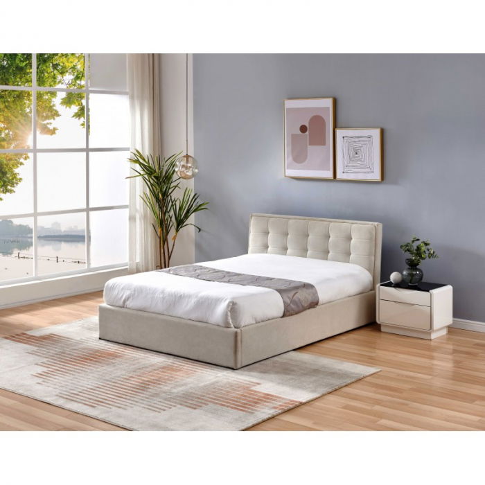 Intr-un dormitor, este nevoie de un pat cat mai util, si cu un design care sa ne înfrumusețeze spațiul. Patul Calypso dispune de o somiera rabatabila ce permite saltea de 160x200 cm, cu spatiu pentru depozitare, tapitat integral cu material tip stofa de nuanta crem deschis. Oferă un design simplistic, cu linii drepte, ce poate fi incadrat in orice tip de dormitor. Produsul este demontat, schita de montaj se afla in colet, iar montajul nu necesita personal calificat. Salteaua sau alte elemente decorative prezentate in imagini nu sunt incluse in pret.