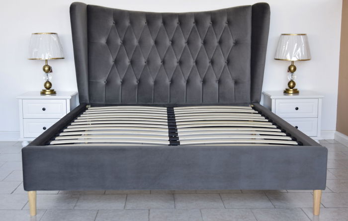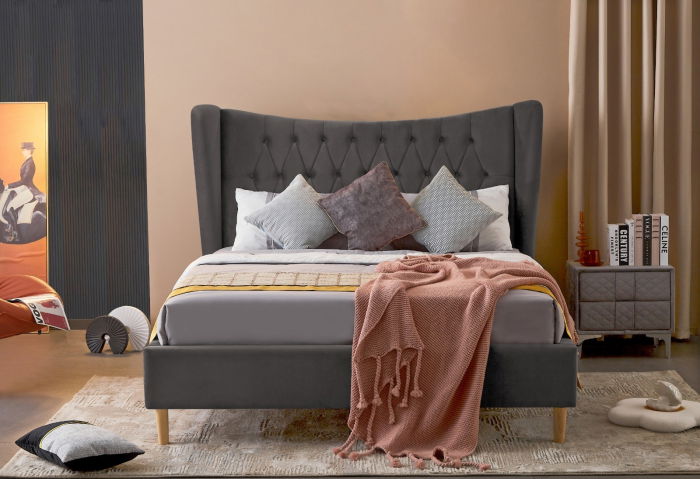 Patul Lora este un pat modern, tapitat din catifea, in nuanta gri, potrivit atat pentru un dormitor matrimonial, cat si pentru un dormitor de tineret. Patul are o dimensiune totala de 220x136x206 cm (LxHxl), permitand o saltea de 180x200 cm.