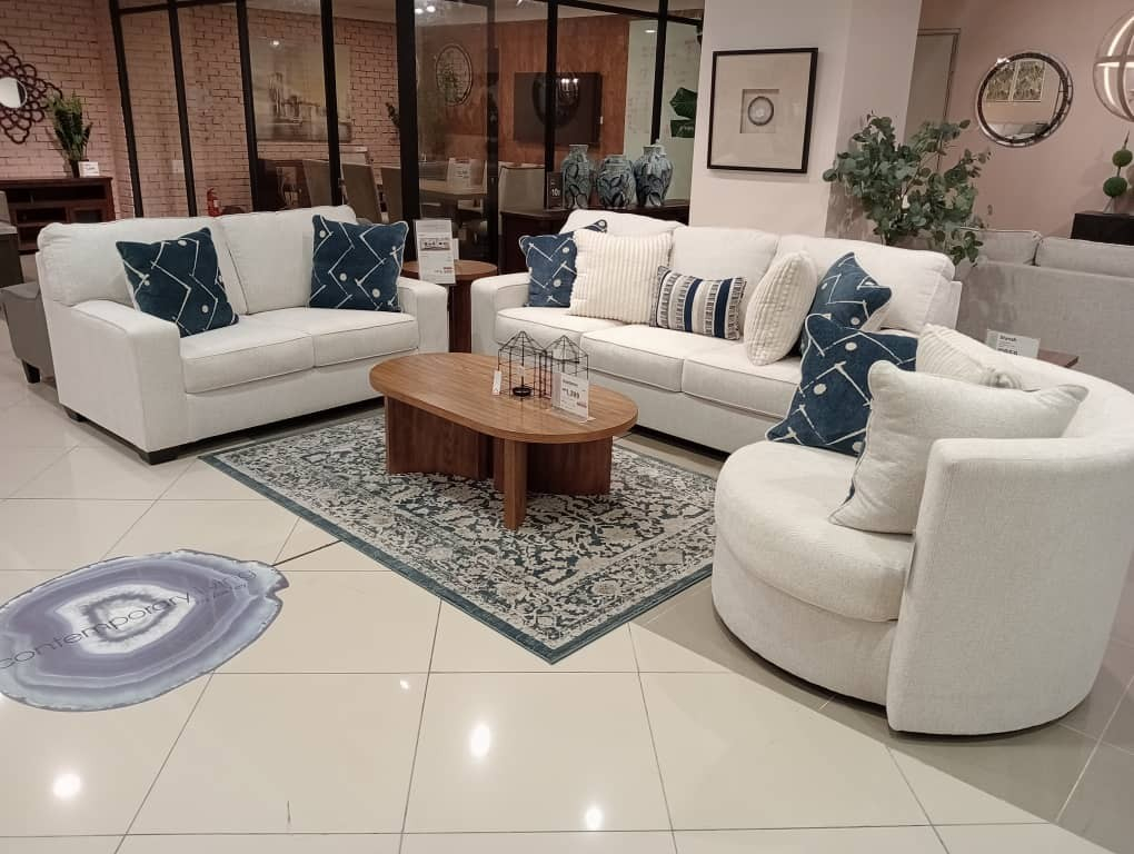 Acest set de living impresionează prin designul său modern, liniile rotunjite și eleganța oferită de tapițeria deschisă la culoare. Compus din două canapele și un fotoliu rotativ, setul creează un ambient rafinat, perfect pentru un living contemporan și primitor.