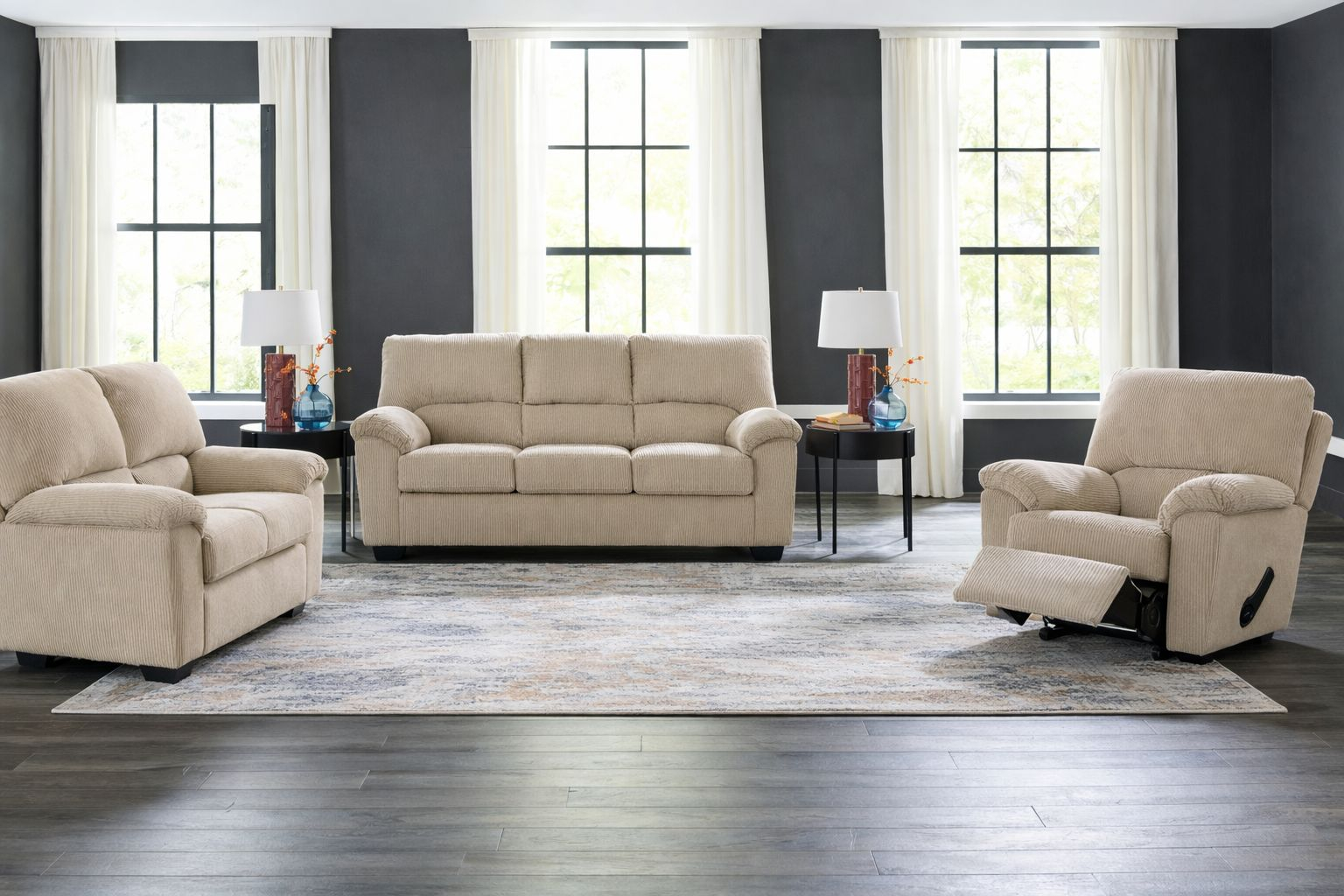 Canapeaua de 3 locuri este spațioasă și confortabilă, cea de 2 locuri este ideală pentru zone mai compacte, iar fotoliul recliner adaugă un plus de relaxare, având suport pentru picioare extensibil și poziție reglabilă.