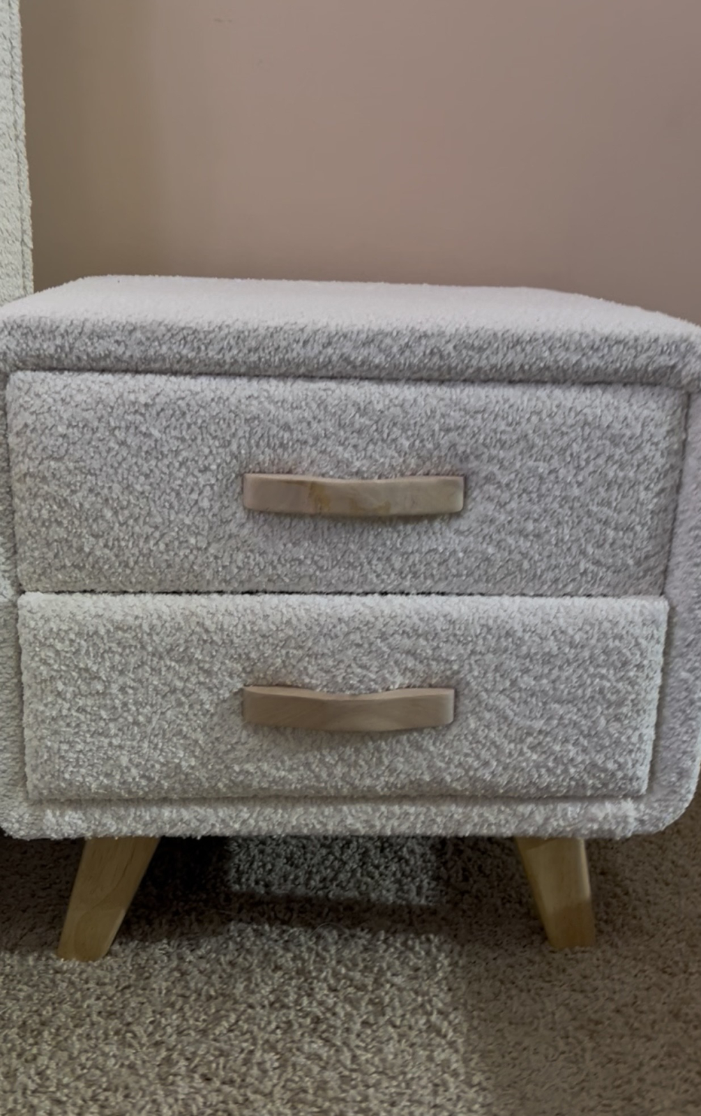 Acesta este setul perfect pentru dormitorul tau, patul si noptierele sunt realizat din material Teddy, texturat si moale la atingere, perfect pentru un dormitor sitl minimalist si contemporan.